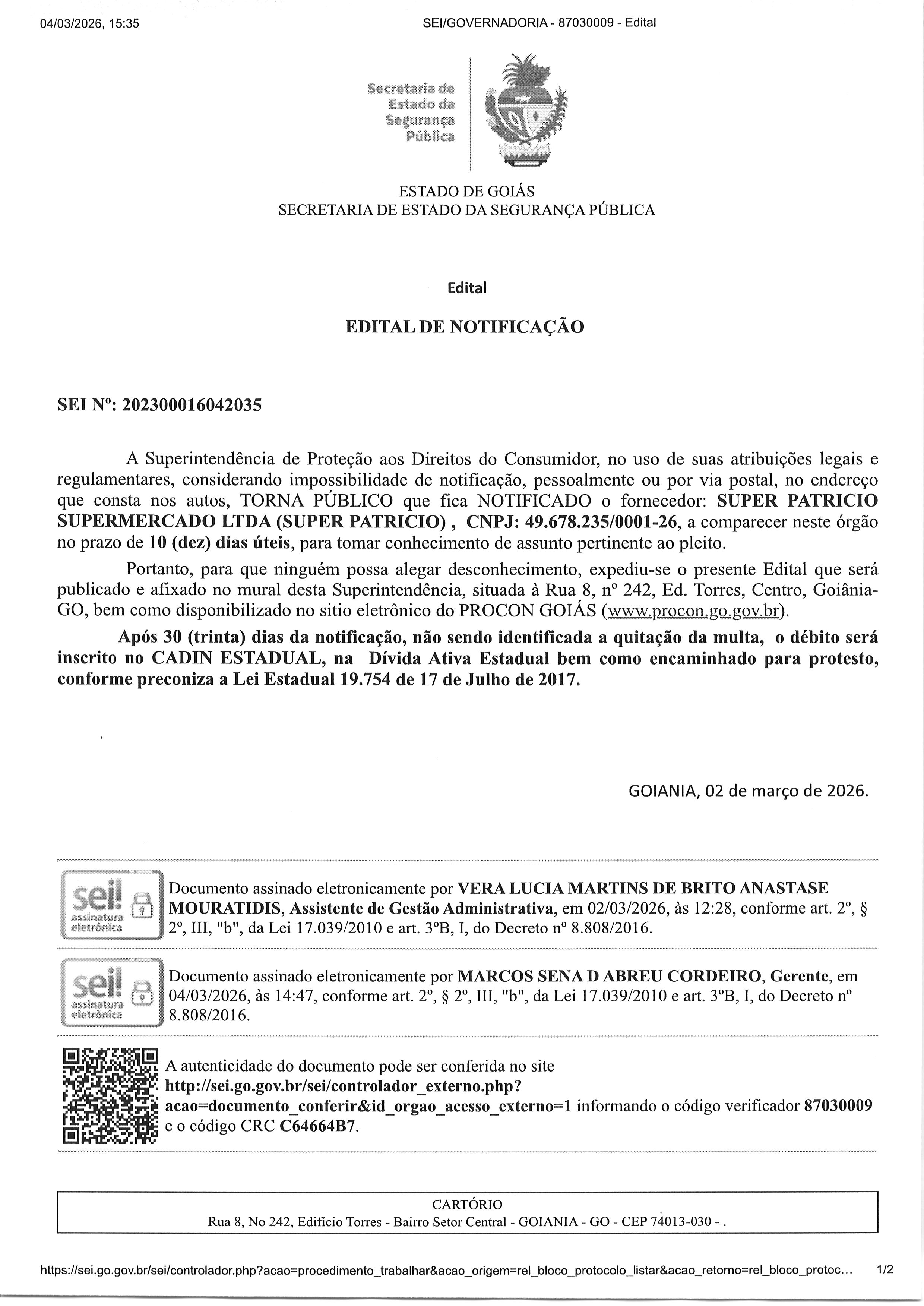 Termo de Notificação Nº 202300016042035, Fornecedor SUPER PATRICIO SUPERMERCADO LTDA Frente Última Atualização em 9 de março de 2026 Categoria Editais de Notificação, Fornecedor