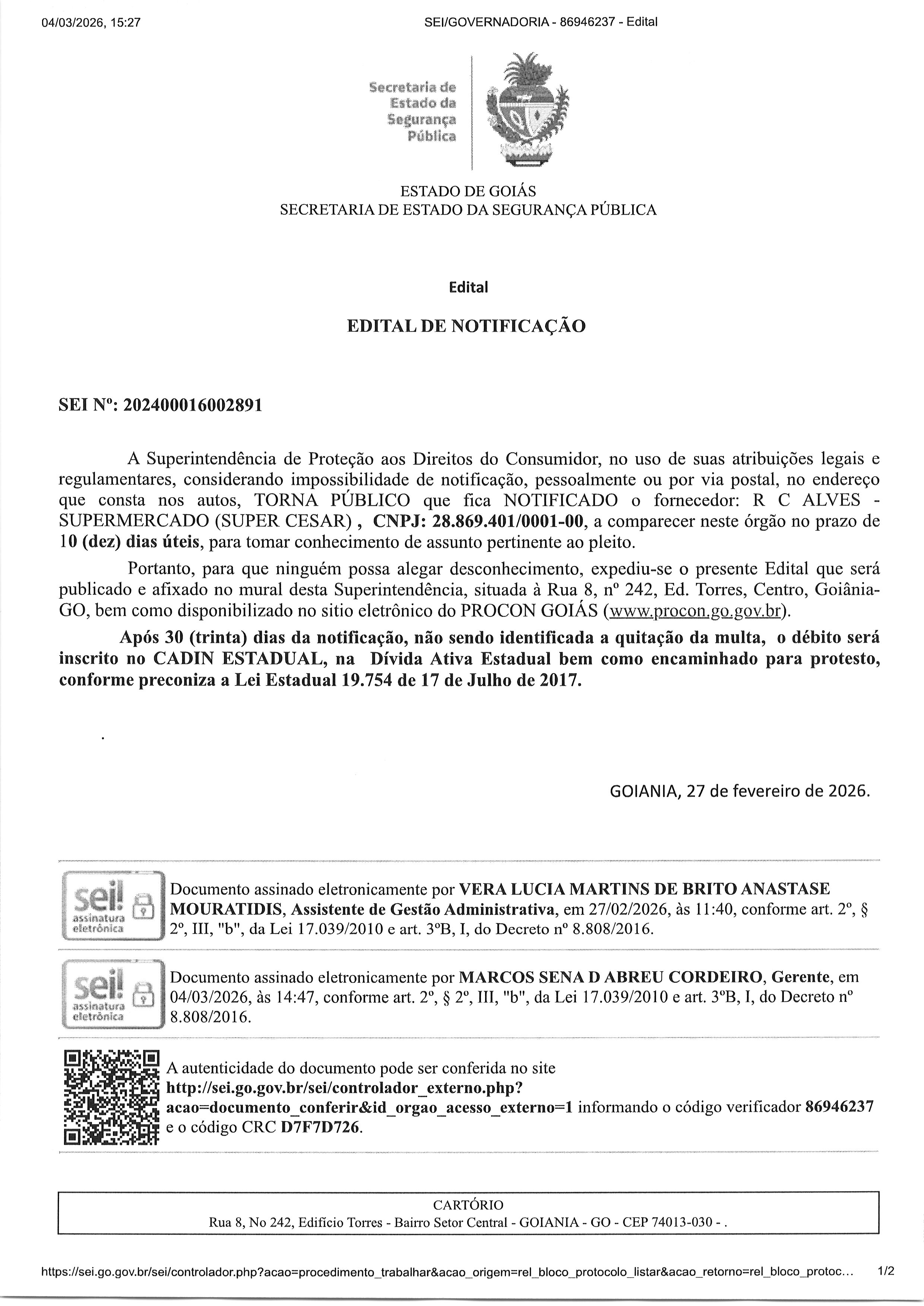 Termo de Notificação Nº 202400016002891, Fornecedor R C ALVES – SUPERMERCADO (SUPER CESAR) Frente Última Atualização em 9 de março de 2026 Categoria Editais de Notificação, Fornecedor