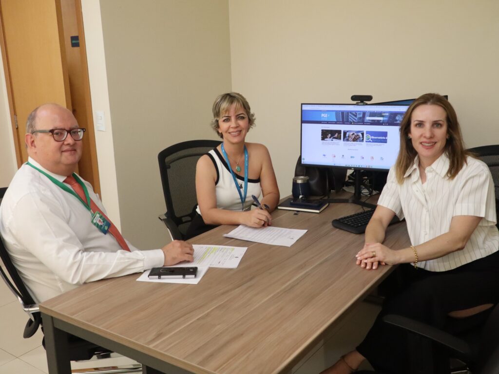 A procuradora Ana Carolina Simarro Rios Chaer, responsável pela Gerência da Dívida Ativa, recebeu o procurador Arnaldo Raggi Júnior, gerente de Processos Administrativos da Procuradoria Setorial da Sead, e a gerente de Contabilidade da pasta, Maria Gilvana de Castro, para dar orientações sobre o cadastro dos dados.