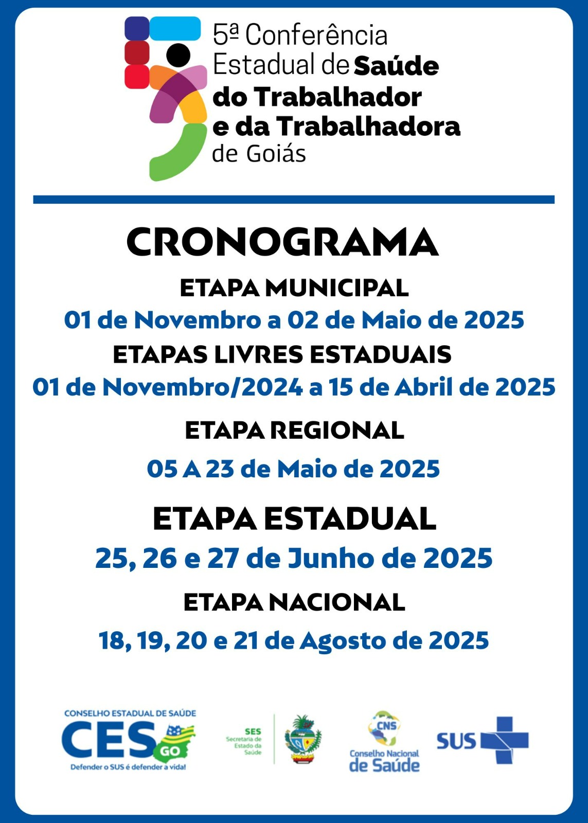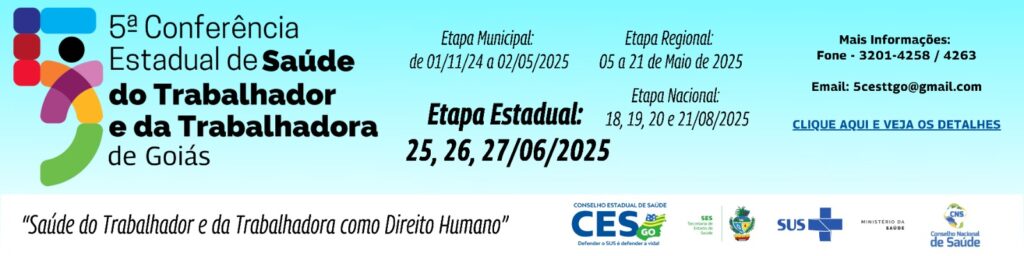 A 5ª Conferência Nacional de Saúde do Trabalhador e da Trabalhadora (CNSTT), é espaço de debate e formulação de políticas públicas para a Saúde do Trabalhador e da Trabalhadora (STT), conceito que abrange a proteção física, mental e social das pessoas trabalhadoras, considerando os riscos no trabalho/ocupação em suas diversas formas (formal, informal, invisíveis, precarizados, etc.). Vai além da mera ausência de doença, engloba bem-estar e condições dignas de trabalho. A Conferência abrangerá todo o território brasileiro, oportunidade para a sociedade manifestar seus anseios e desejos para a garantia de um trabalho digno e que não seja adoecedor. Foi convocada, a partir de uma deliberação das pessoas delegadas da 17ª CNS (julho de 2023) realizada em Brasília, com o Tema: Saúde do Trabalhador e da Trabalhadora como Direito Humano e os eixos: 1) Política Nacional de Saúde do Trabalhador e da Trabalhadora; 2) As novas relações de trabalho e a saúde do trabalhador e da trabalhadora; e 3) Participação popular na saúde dos trabalhadores e das trabalhadoras para o Controle Social. Seguindo a convocação do CNS, o CES-GO por meio da Resolução Ad Referendum nº 8/2024 Convocou a 5ª Conferência Estadual de Saúde do Trabalhador e da Trabalhadora (CESTT).