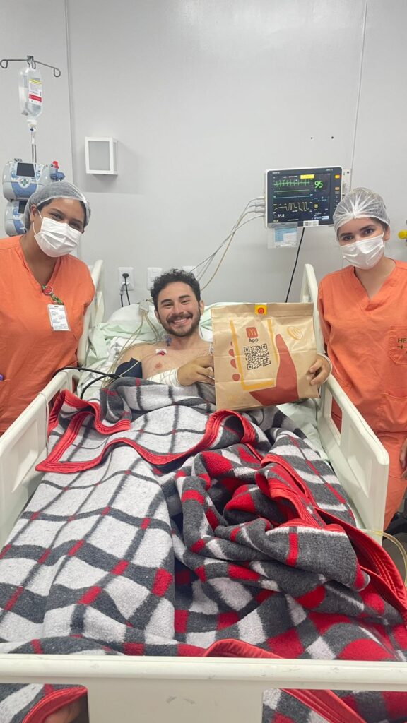 Vinicius sofreu o acidente ao buscar a namorada no trabalho. Antes da colisão, o casal conversava sobre a vontade de matar a saudade de comer um sanduíche. Após dias internado e passando por procedimentos cirúrgicos delicados, ele foi surpreendido com o lanche que desejava ao sair da cirurgia do quadril, realizada nesta semana.
