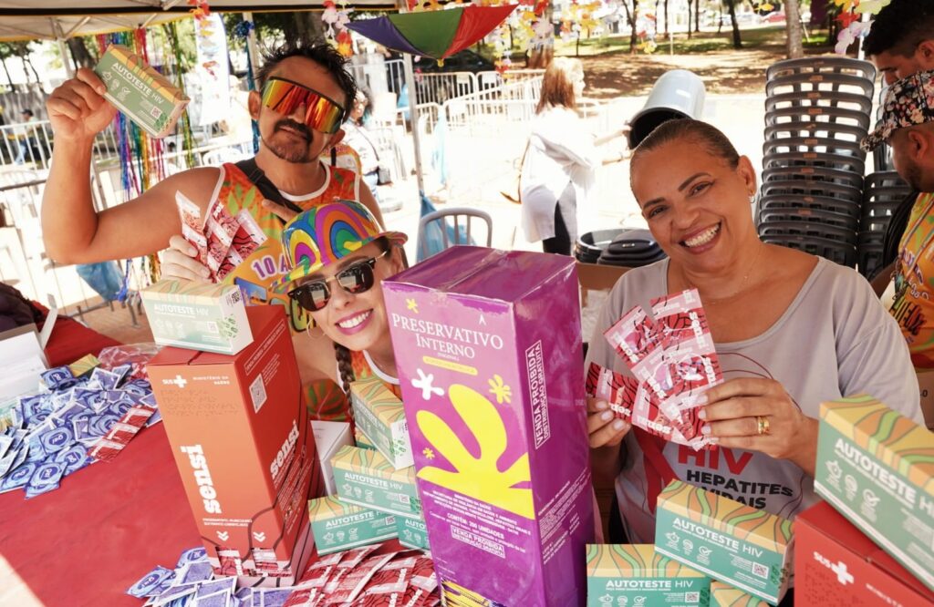 A equipe da Coordenação de Agravos Transmissíveis e ISTs da SES fez a distribuição de preservativos, gel lubrificante e autotestes de HIV durante o desfile do Bloco Esquenta LGBTQIA+A ação teve o objetivo de conscientizar as pessoas que participavam do carnaval a adotar medidas preventivas à contaminação de infecções sexualmente transmissíveisProfissionais da SES mostram o material distribuído durante a ação, que encerrou a Campanha de Prevenção às ISTs e Aids, realizada antes e durante o carnaval