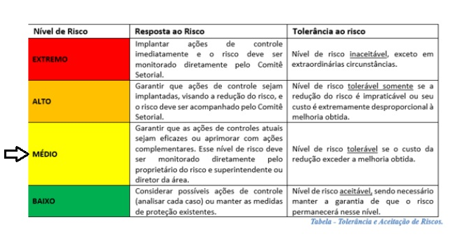 Na tabela a seguir consta o modelo para definir parâmetros relativos ao nível de risco que deverá receber ações de controle e qual é a tolerância aceitável para a Secretaria: