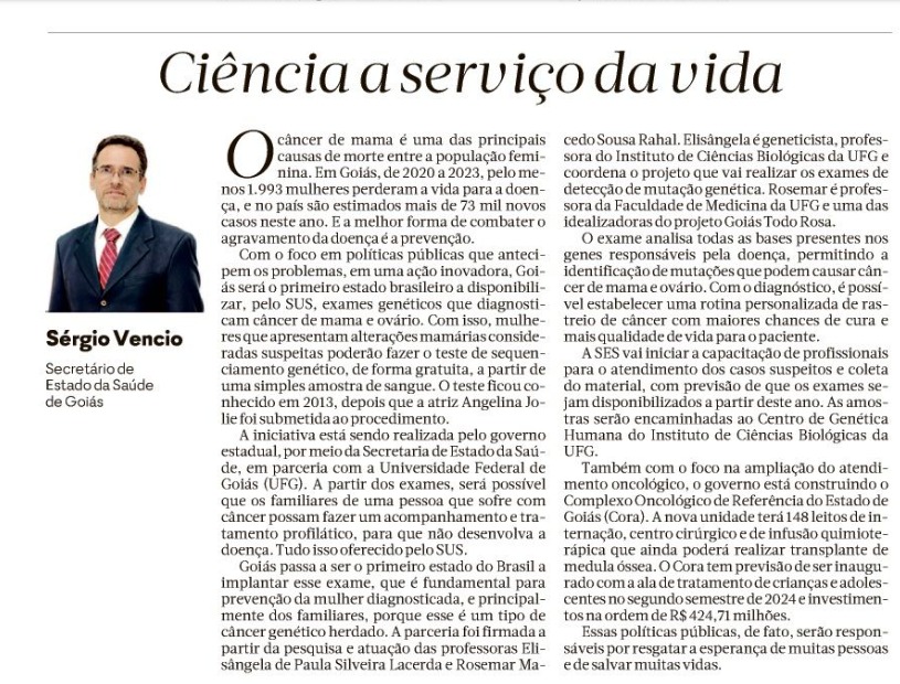 Goiás foi o primeiro estado brasileiro a oferecer exames genéticos pelo Sistema Único de Saúde (SUS) para diagnóstico de câncer de mama e ovário. A parceria foi firmada entre o Governo de Goiás, por meio da Secretaria de Estado da Saúde (SES-GO), e a Universidade Federal de Goiás (UFG) em outubro de 2023. Os primeiros testes começaram em janeiro de 2024.