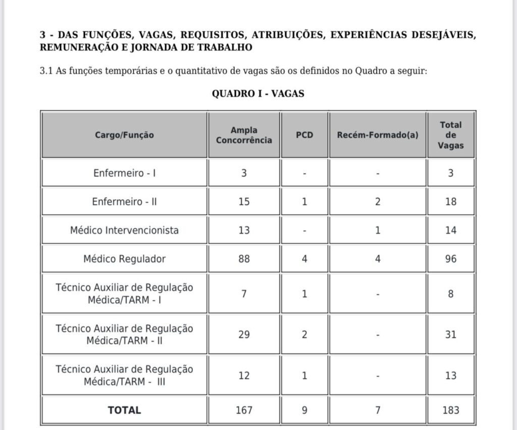 São 183 vagas disponíveis, sendo destinadas a médicos intervencionistas e enfermeiros para o Siate, além de médicos reguladores, enfermeiros e técnicos auxiliares de regulação médica para o CRE. Vencimentos variam de R$ 1.046,20 a R$ 5.509,63. Inscrições iniciam em 10/01
