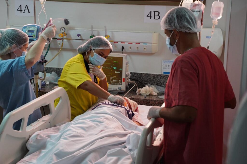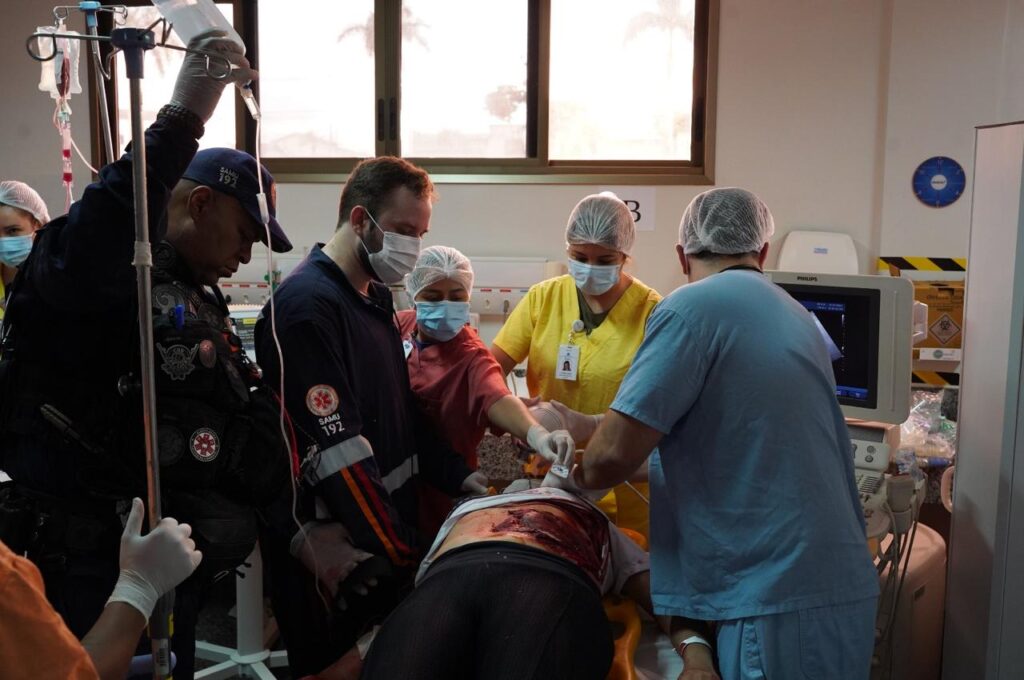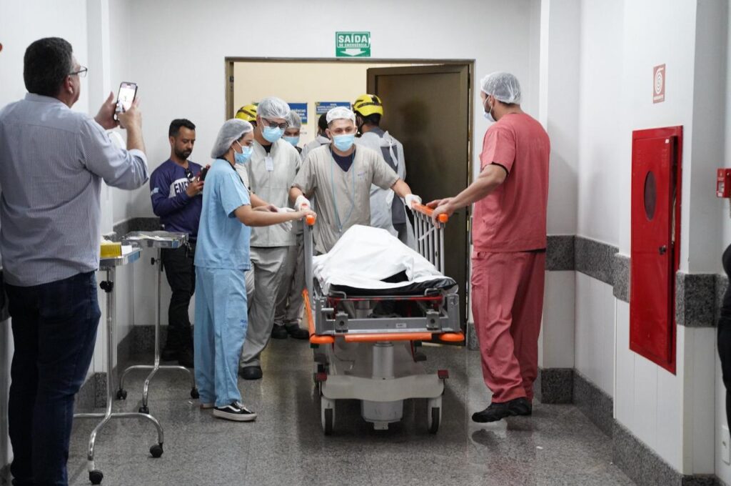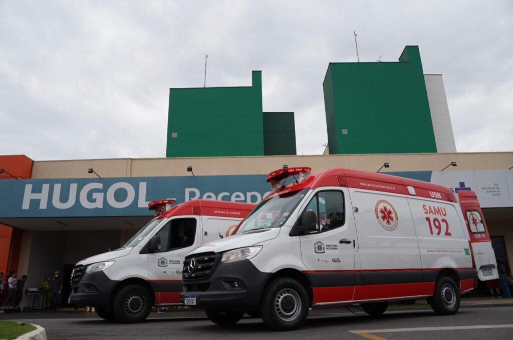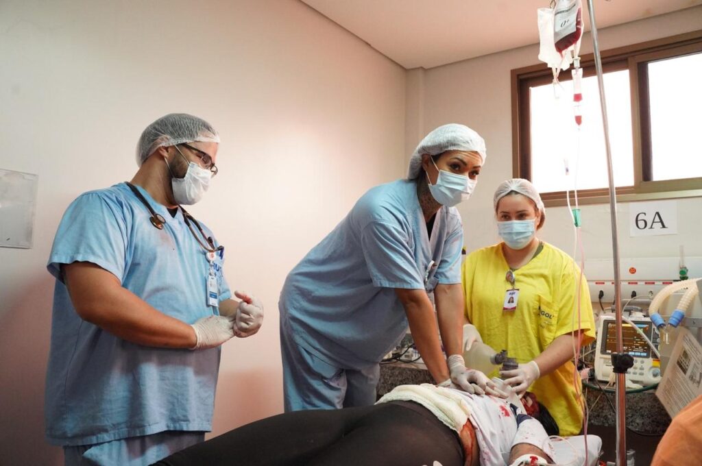 O secretário Rasível Santos assistiu à 4ª Simulação Realista de Catástrofe e Desastre feita pela equipe do HugolA simulação envolveu profissionais do Samu, que realizam o transporte das vítimas à unidadeA equipe simulou o atendimento a múltiplas vítimas de acidente de trânsito, um tipo frequente de demanda que chega ao HugolA simulação de atendimento, feita anualmente, é essencial para o treinamento profissional e emocional da equipeA simulação realista mobilizou equipes de diferentes setores do HugolOs profissionais do Hugol simularam os procedimentos essenciais de urgência e emergência no atendimento às vítimas