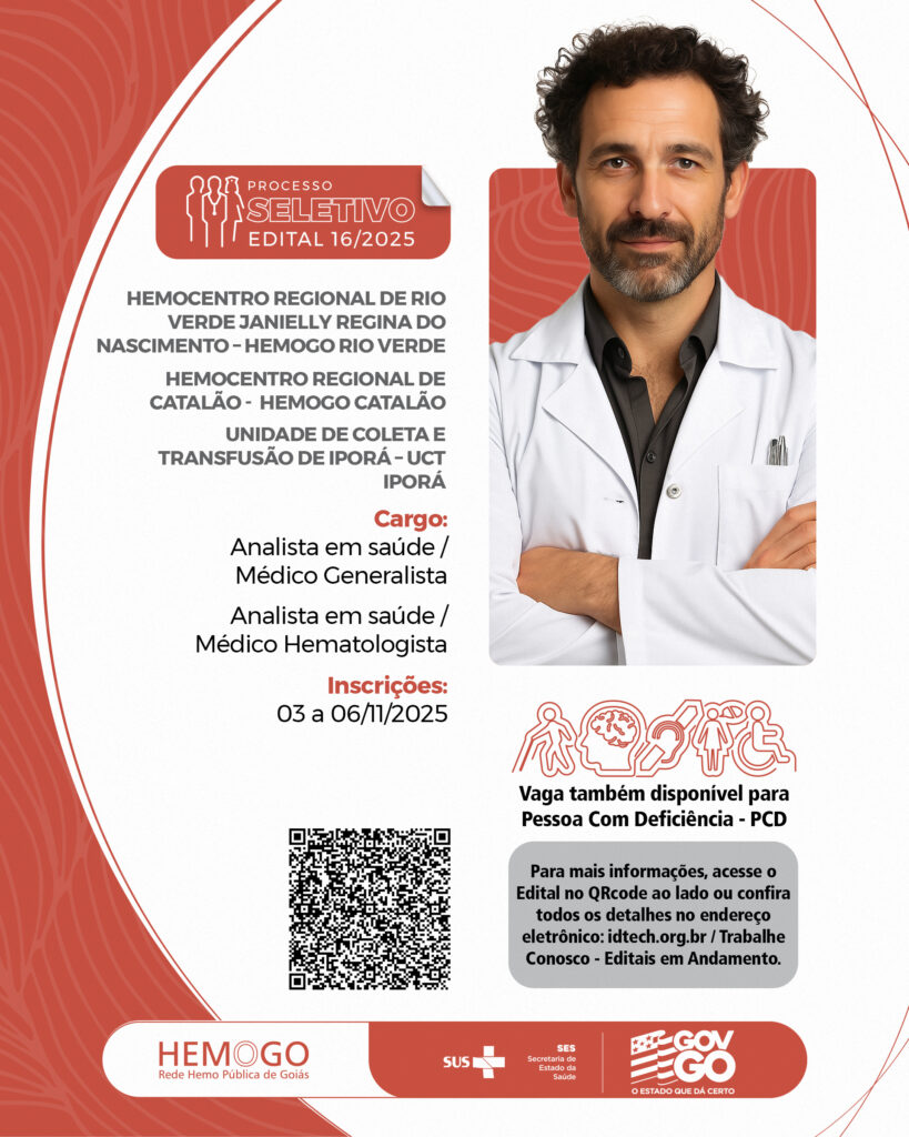 O Instituto de Desenvolvimento Tecnológico e Humano (Idtech), responsável pela gestão da Rede Estadual de Serviços Hemoterápicos (Rede Hemo), lançou processo seletivo para contratação imediata e formação de cadastro de reserva para os cargos de analista em saúde/médico generalista e analista em saúde/médico hematologista. Os selecionados vão atuar nos Hemocentros Regionais de Rio Verde Janielly Regina do Nascimento (Hemogo Rio Verde), de Catalão (Hemogo Catalão) e Unidade de Coleta e Transfusão de Iporá (UCT Iporá).
