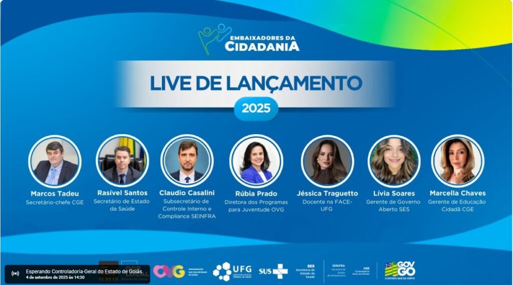 A Secretaria de Estado da Saúde de Goiás (SES-GO) marcou presença na live de lançamento do Embaixadores da Cidadania 2025, realizada nesta quinta-feira (04/09), no canal da Controladoria-Geral do Estado (CGE) no Youtube. Ao todo, mais de 1 mil pessoas participaram do encontro online, que marcou também o dia de início dos cursos teóricos do programa.