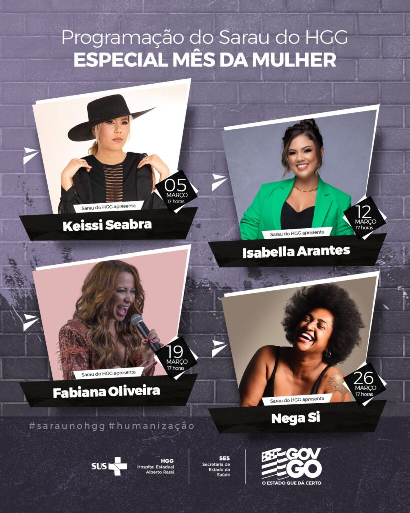 Em celebração ao Dia Internacional da Mulher, comemorado em 8 de março, o Hospital Estadual Dr. Alberto Rassi – HGG preparou uma programação especial para o Sarau do HGG. Ao longo do mês, as quatro apresentações do projeto serão conduzidas exclusivamente por mulheres que se destacam na cena cultural goianiense: Keissi Seabra, Isabella Arantes, Fabiana Oliveira e Nega Si.