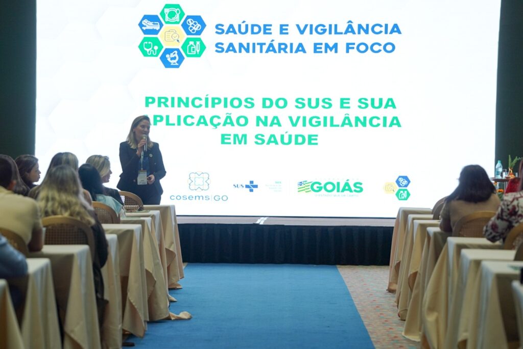 No 1º dia do evento, a superintendente de Vigilância Sanitária, Ambiental e Saúde do Trabalhador da SES-GO, Eliane Rodrigues da Cruz, fala sobre os Princípios do SUS e sua aplicação na Vigilância em Saúde