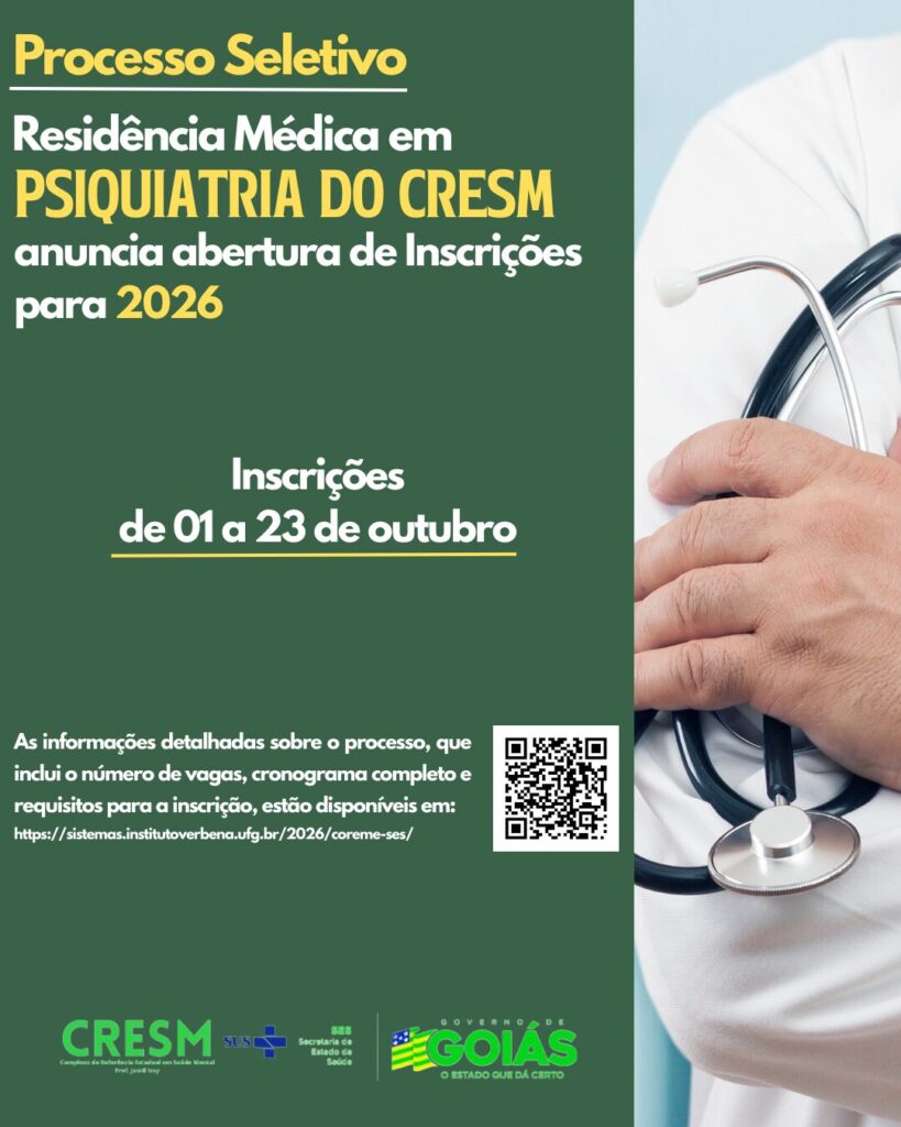 O Complexo de Referência Estadual em Saúde Mental Prof. Jamil Issy (Cresm) vai abrir, de 1º a 23 de outubro, as inscrições para os candidatos ao Processo Seletivo Unificado da Secretaria de Estado da Saúde de Goiás (SES-GO). A comissão organizadora do certame é Instituto Verbena, da Universidade Federal de Goiás (https://institutoverbena.ufg.br/)