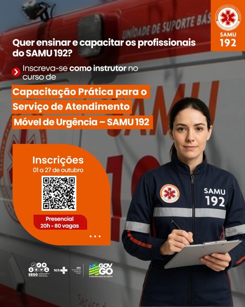 A Secretaria de Estado da Saúde de Goiás (SES-GO), por meio da Superintendência da Escola de Saúde de Goiás (SESG), publicou o Edital nº 34/2025 com a abertura de chamada pública para seleção de docentes facilitadores que irão atuar na capacitação prática do Serviço de Atendimento Móvel de Urgência (SAMU 192).