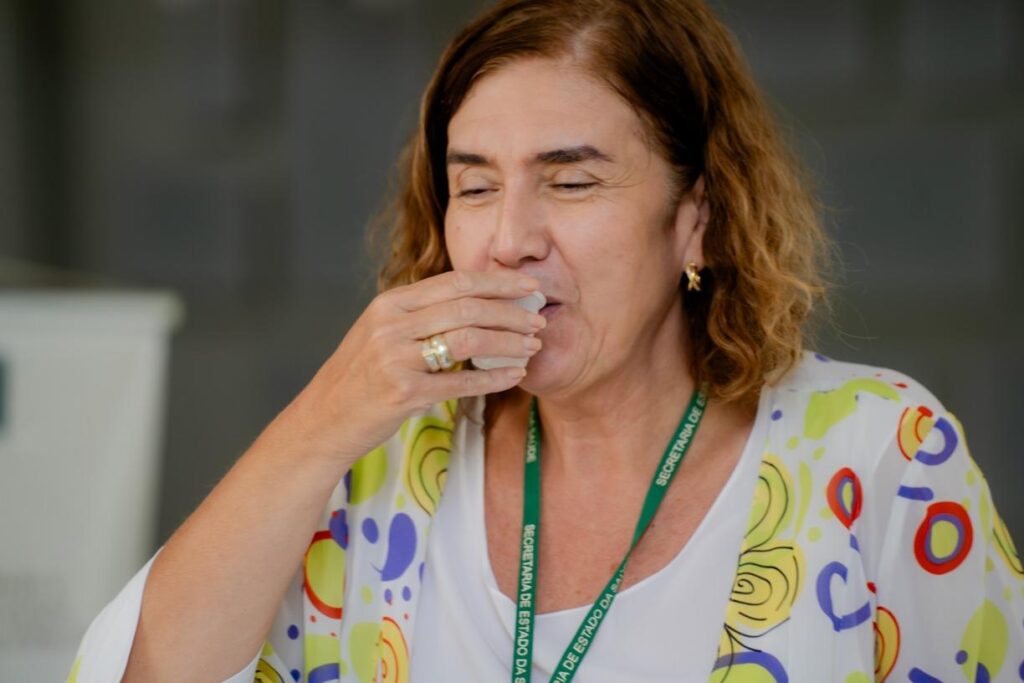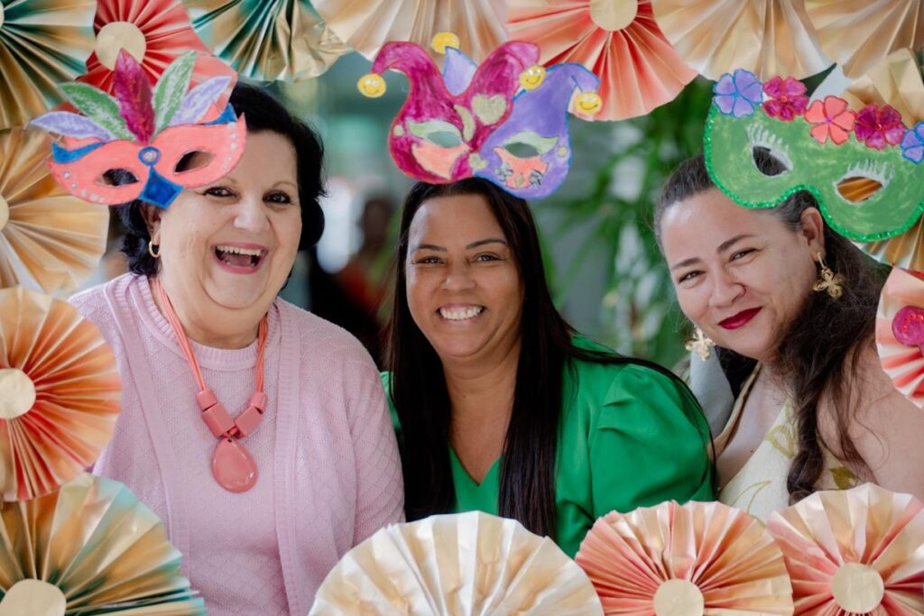 O hall da SES-GO foi decorado para a celebração do carnaval, feita com a realização de palestras e confraternizaçãoA gerente de Humanização, Salette Paulino, ao lado de integrantes da equipe, Vera Lúcia Sá e Renata Oliveira, na celebração do carnavalServidora Marlice Marques toma as gotinhas homeopáticas da dengue durante a celebração do carnaval na SES