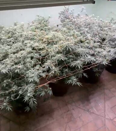 Aproximadamente 200 pés de maconha: Plantas em diferentes fases de crescimento, indicando uma produção contínua.