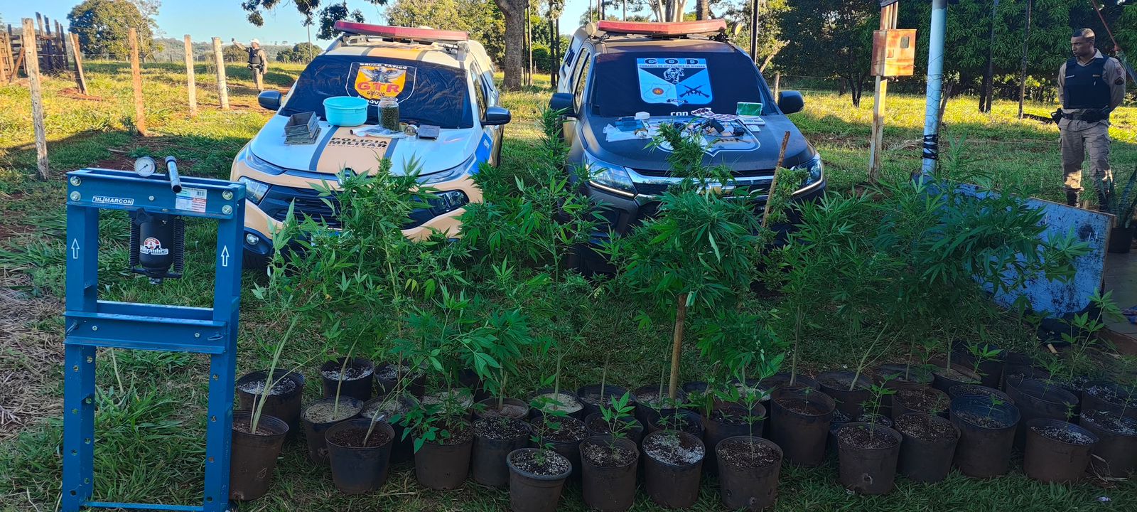 Uma operação integrada entre o Comando de Operações de Divisas (COD-PMGO) e o 2º Pelotão da Polícia Militar Rodoviária (PMRV) da 6ª CIA PMRV/BPMRV, juntamente com a Companhia de Policiamento Especializado (CPE) da PMMG, resultou na prisão de um foragido da justiça, na apreensão de uma arma de fogo e na erradicação de diversos pés de maconha em Minas Gerais. Durante a ação, os policiais localizaram o foragido, que estava escondido no distrito de Bálsamo/MG. O indivíduo, com mandado de prisão em aberto por tráfico de drogas, havia fugido e passou a ostentar arma de fogo, além de continuar a comercializar entorpecentes em cidades de Goiás e Minas Gerais. Com ele, foram apreendidos ainda uma prensa hidráulica, uma balança de precisão, um rádio comunicador e dois celulares. A estimativa é de que o prejuízo causado ao crime organizado chegue a R$ 50 mil. Como resultado da ação, além da prisão de um homem, foram apreendidos também uma arma, dezenas de maconha, uma prensa hidráulica, uma balança de precisão, um rádio comunicador e dois aparelhos celulares.