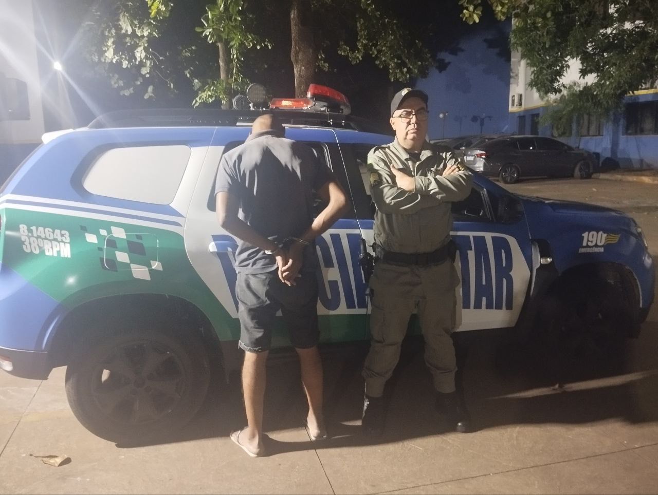 No Setor Centro-Oeste, em Goiânia, uma equipe do 38º Batalhão da Polícia Militar foi acionada via COPOM para atender uma ocorrência de violência doméstica. A vítima relatou que foi agredida fisicamente pelo companheiro, que a lançou contra a parede e ameaçou matá-la caso ela tentasse deixá-lo. Ela estava trancada dentro da residência e precisou pular o muro para pedir ajuda. A mulher manifestou o desejo de representar criminalmente contra o agressor, que recebeu voz de prisão no local. Ele foi encaminhado à Delegacia Especializada no Atendimento à Mulher (DEAEM), onde a prisão foi ratificada e lavrado o Auto de Prisão em Flagrante pelos crimes de ameaça (art. 147) e injúria (art. 140) do Código Penal.