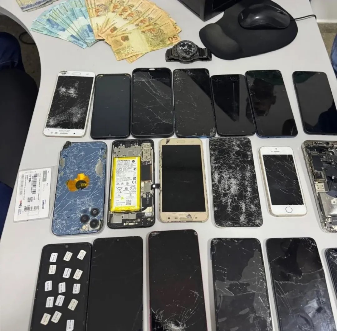 Os policiais civis localizaram o terceiro suspeito em sua residência, onde foram apreendidos diversos aparelhos celulares, chips telefônicos e a quantia de R$ 2.300,00 em dinheiro. Com outro investigado também foram encontrados R$ 315,00 em espécie.