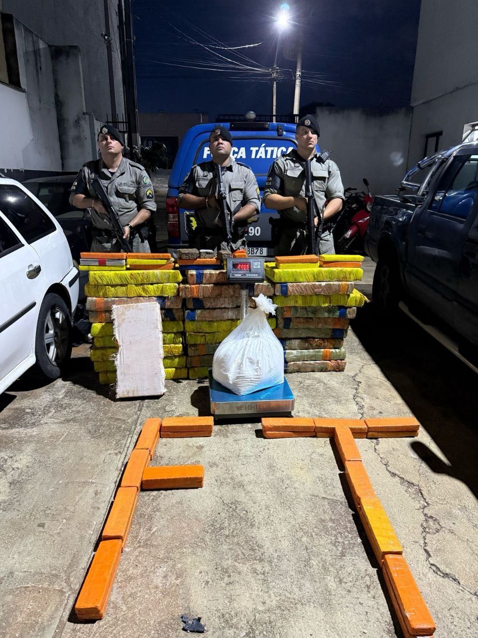 Resultado final da ocorrência: 1 Indivíduo Conduzido; 344kg de maconha separados em peças apreendidas; 22,6 kg de cocaína em uma sacola grande apreendida; um celular e uma balança de precisão aprendidos.