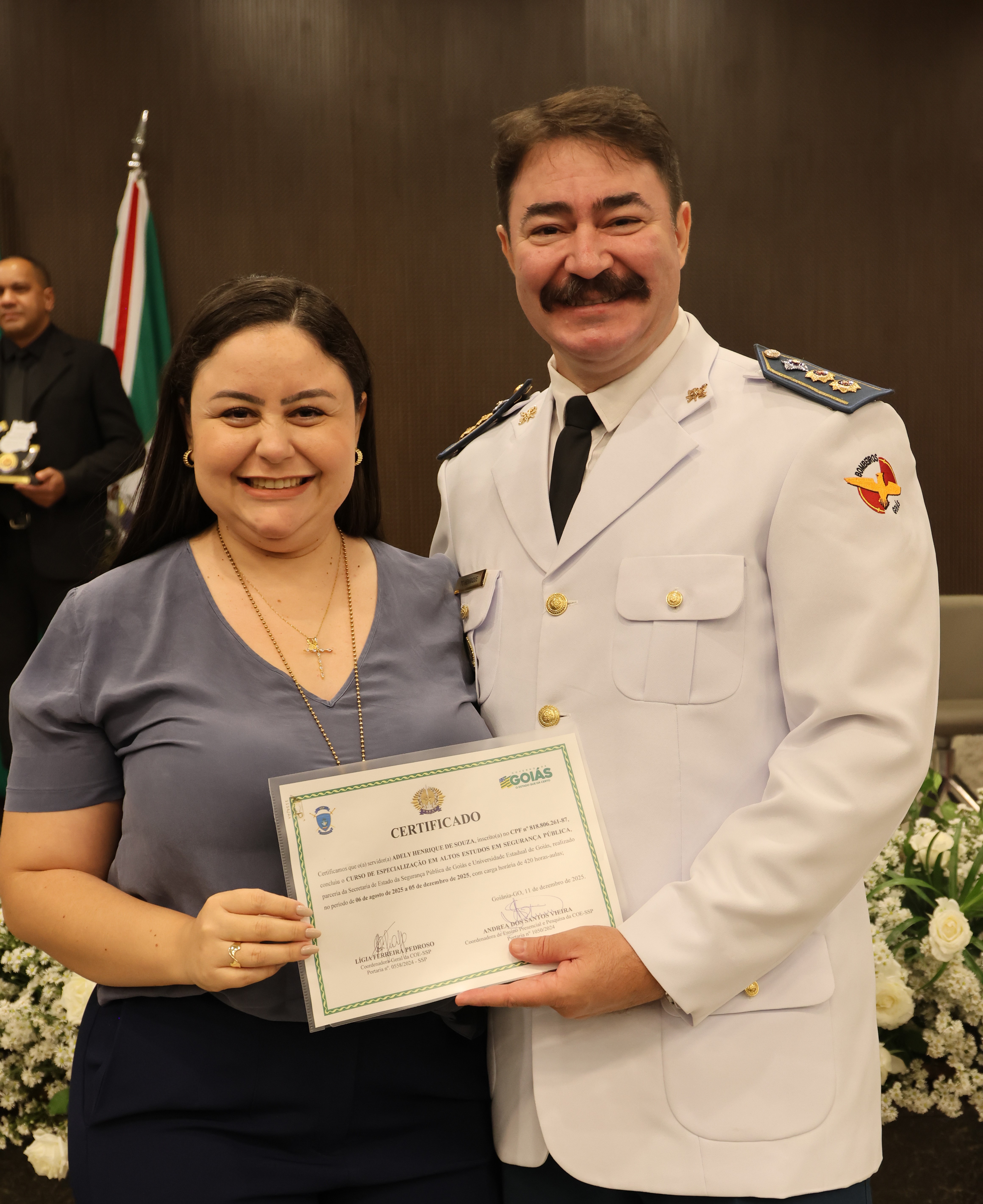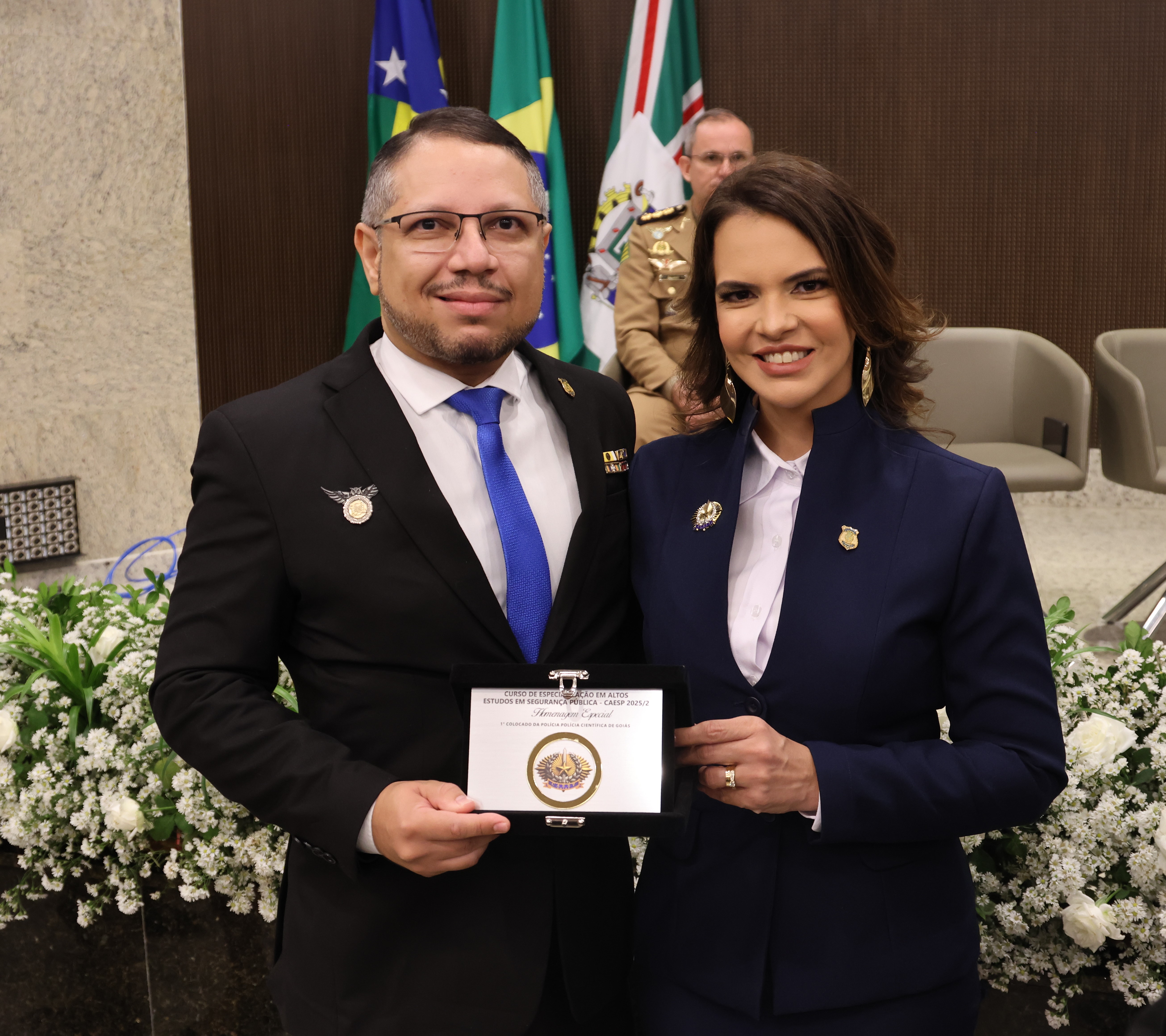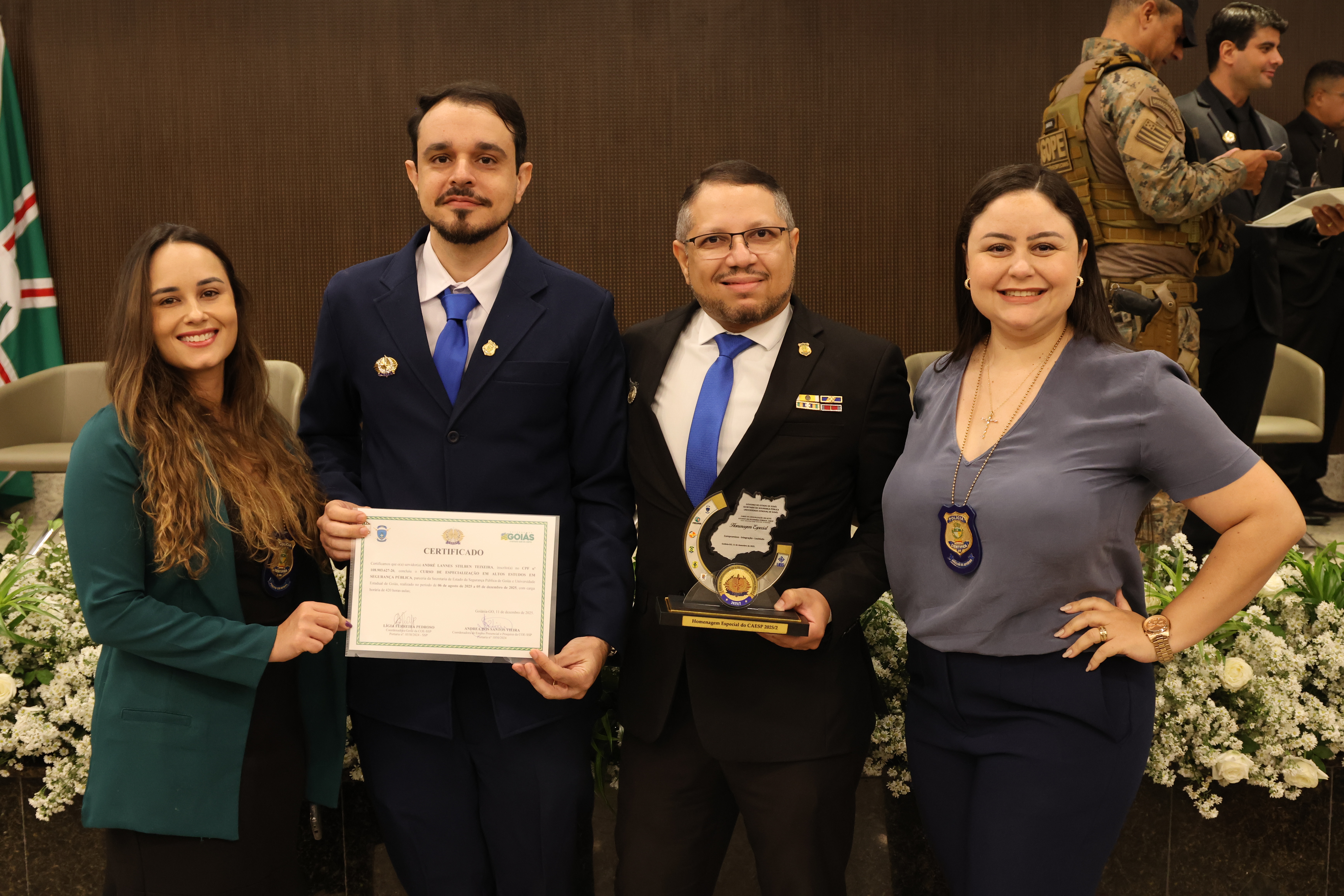 “Parabéns à turma por essa belíssima homenagem. Não vamos trazê-lo de volta, mas é uma maneira de eternizá-lo, de ter aqui no nosso coração pelo belo trabalho que ele exerceu. Com certeza, ele está lá em cima e vai estar abençoando o nosso trabalho aqui na terra”, disse o secretário de Segurança Pública de Goiás, Renato Brum dos Santos, que presidiu a cerimônia de formatura. “Esse curso é importante para nos aprimorarmos, refletirmos e cumprirmos a nossa etapa para que possamos estar habilitados”, completou Brum.