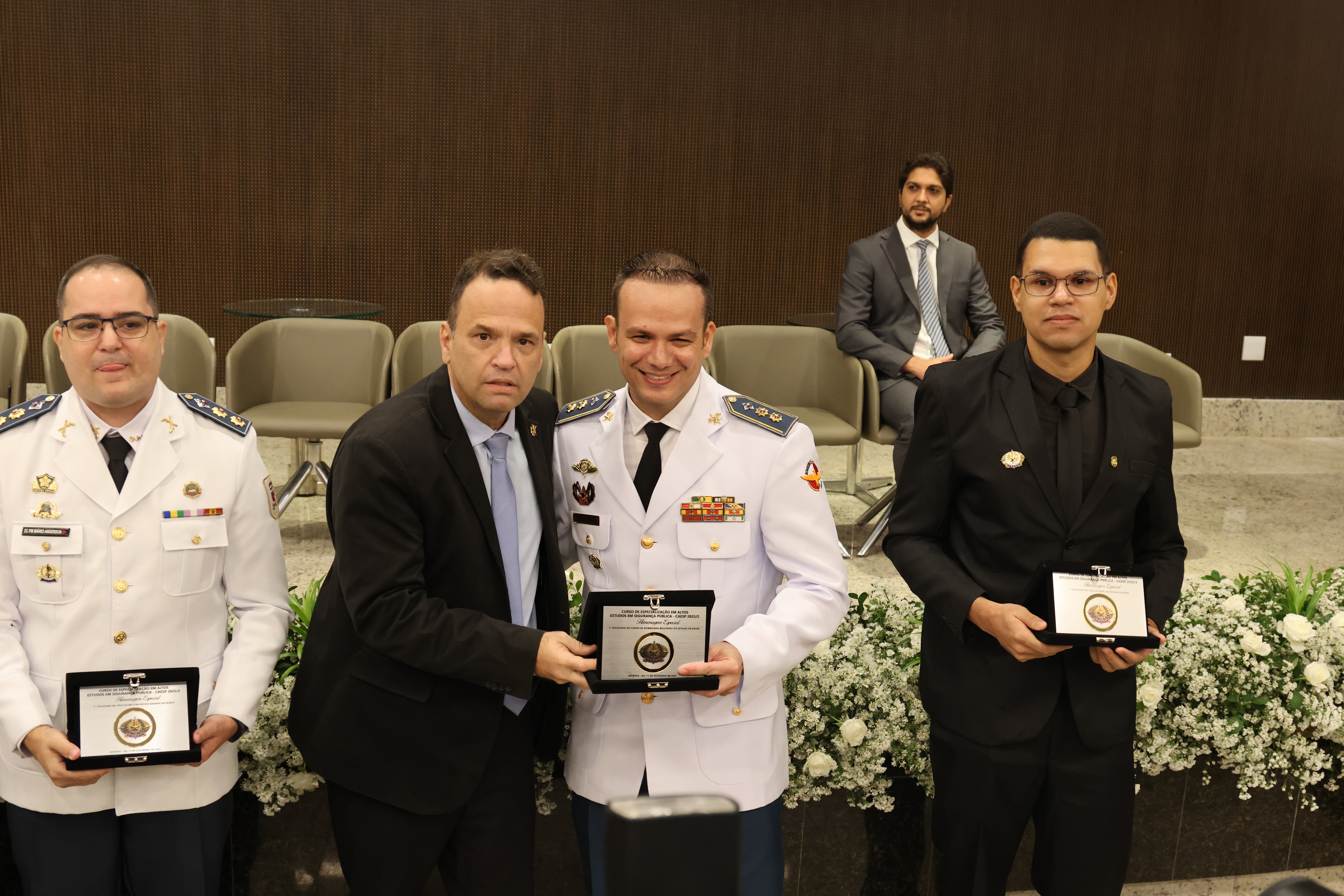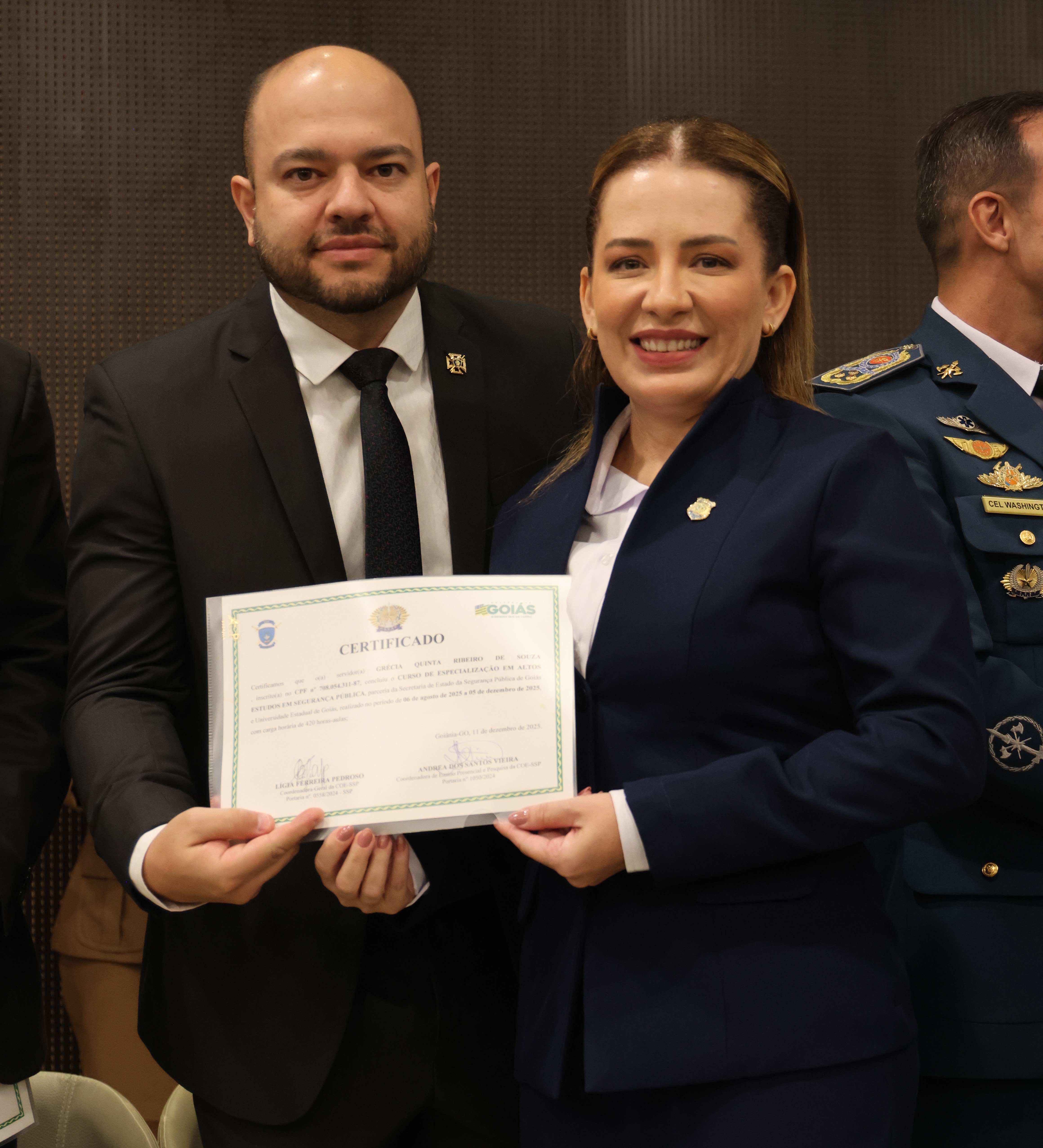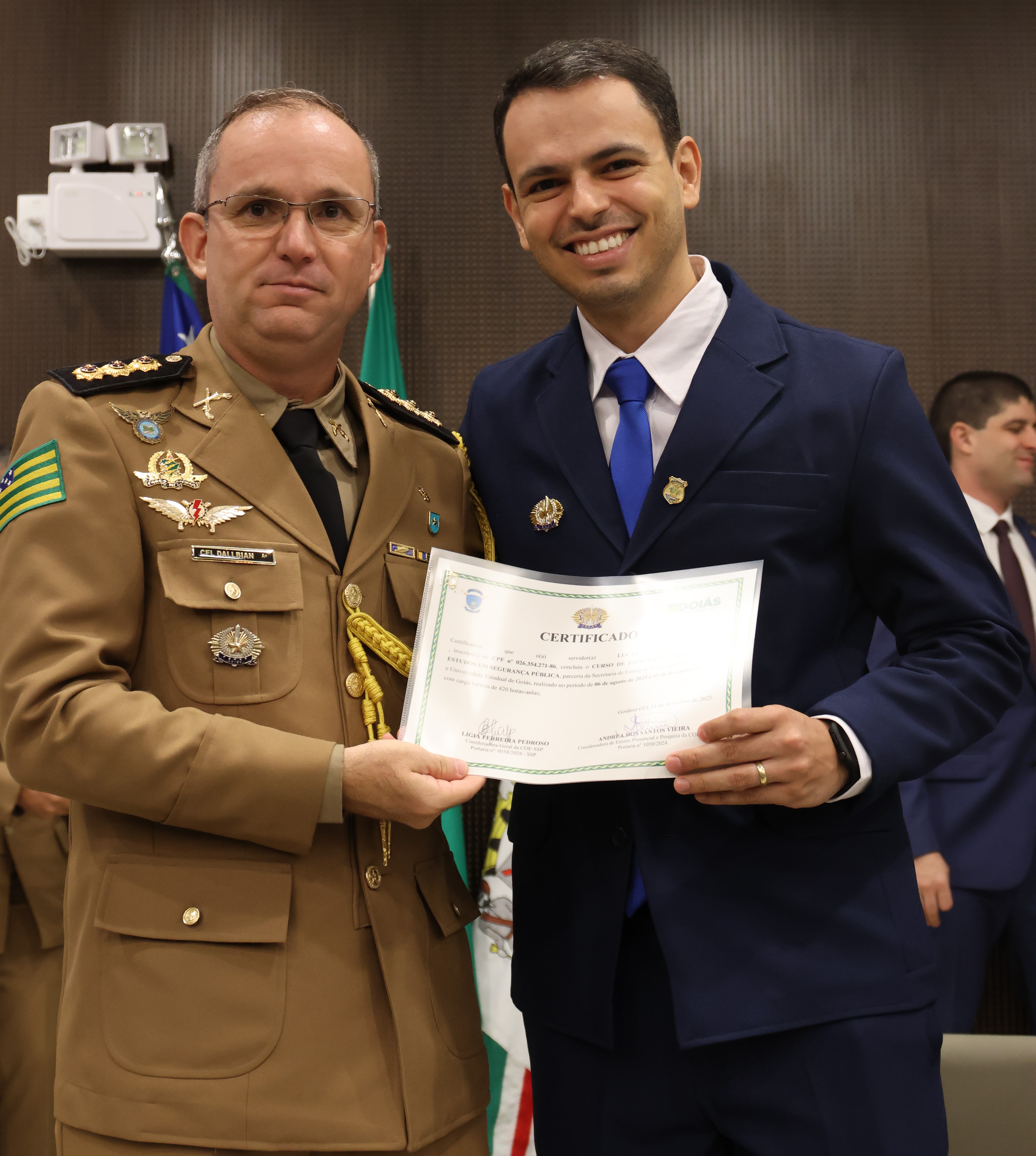 “Parabéns à turma por essa belíssima homenagem. Não vamos trazê-lo de volta, mas é uma maneira de eternizá-lo, de ter aqui no nosso coração pelo belo trabalho que ele exerceu. Com certeza, ele está lá em cima e vai estar abençoando o nosso trabalho aqui na terra”, disse o secretário de Segurança Pública de Goiás, Renato Brum dos Santos, que presidiu a cerimônia de formatura. “Esse curso é importante para nos aprimorarmos, refletirmos e cumprirmos a nossa etapa para que possamos estar habilitados”, completou Brum.